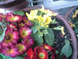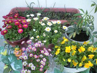 | 春爛漫のテーブル。 デージー(赤)、ノースポール(白) クモマ草(ピンク)、ビオラ(黄色) |