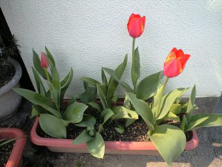 | チューリップが咲きました! 白やピンクも植えてますが 今咲いているのは赤だけ。 色によって成長の違いがあるのか? |