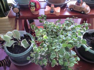 仕事部屋の癒しコーナーv 一番お気に入りのプミラです。 観葉植物の鉢はただいま八個……。 |